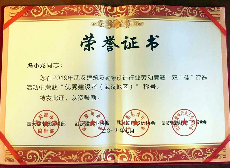 近日,由楚天都市報、武漢建筑業(yè)協(xié)會、武漢勘察設(shè)計協(xié)會、武漢市建筑行業(yè)工會聯(lián)合會聯(lián)合主辦,被譽為武漢城建行業(yè)“奧斯卡”的2019年武漢建筑及勘察設(shè)計行業(yè)勞動競賽“雙十佳”評選頒獎典禮,在楚天傳媒大廈隆重舉行。天馬建設(shè)集團北洋橋舜安碧水文化體育活動中心項目經(jīng)理馮小龍榮獲武漢建筑及勘察設(shè)計行業(yè)“優(yōu)秀建設(shè)者(武漢地區(qū))”榮譽稱號。