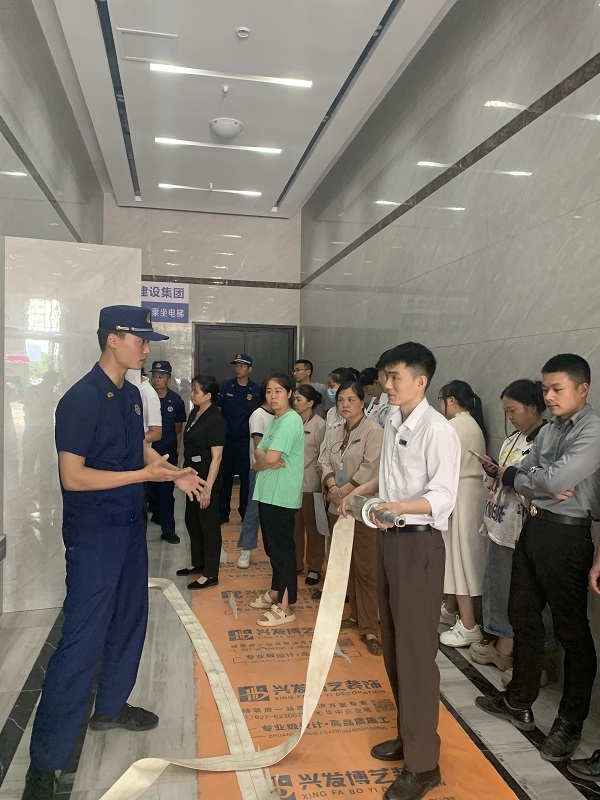 在生動(dòng)有趣的消防安全培訓(xùn)結(jié)束后,消防支隊(duì)專家與集團(tuán)全體員工到大廈一樓進(jìn)行實(shí)地演練,消防支隊(duì)專家們逐一介紹滅火器材和消防水帶的使用方法及相關(guān)注意事項(xiàng)。集團(tuán)員工在認(rèn)真聽完介紹后主動(dòng)實(shí)踐,將理論知識(shí)內(nèi)化于心,實(shí)踐于行。
