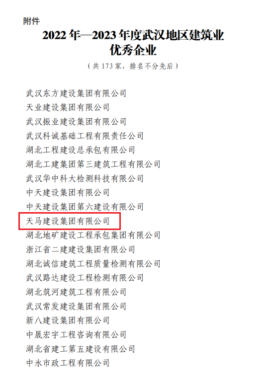 近日,天馬建設(shè)集團(tuán)榮獲2023年度武漢市最具成長(zhǎng)性企業(yè)和2022-2023年度武漢地區(qū)建筑業(yè)優(yōu)秀企業(yè),集團(tuán)黨委書記、董事長(zhǎng)馮義橋獲“優(yōu)秀企業(yè)家”,集團(tuán)總工程師劉剛獲“優(yōu)秀總工程師”,余勝武獲“優(yōu)秀項(xiàng)目經(jīng)理”。